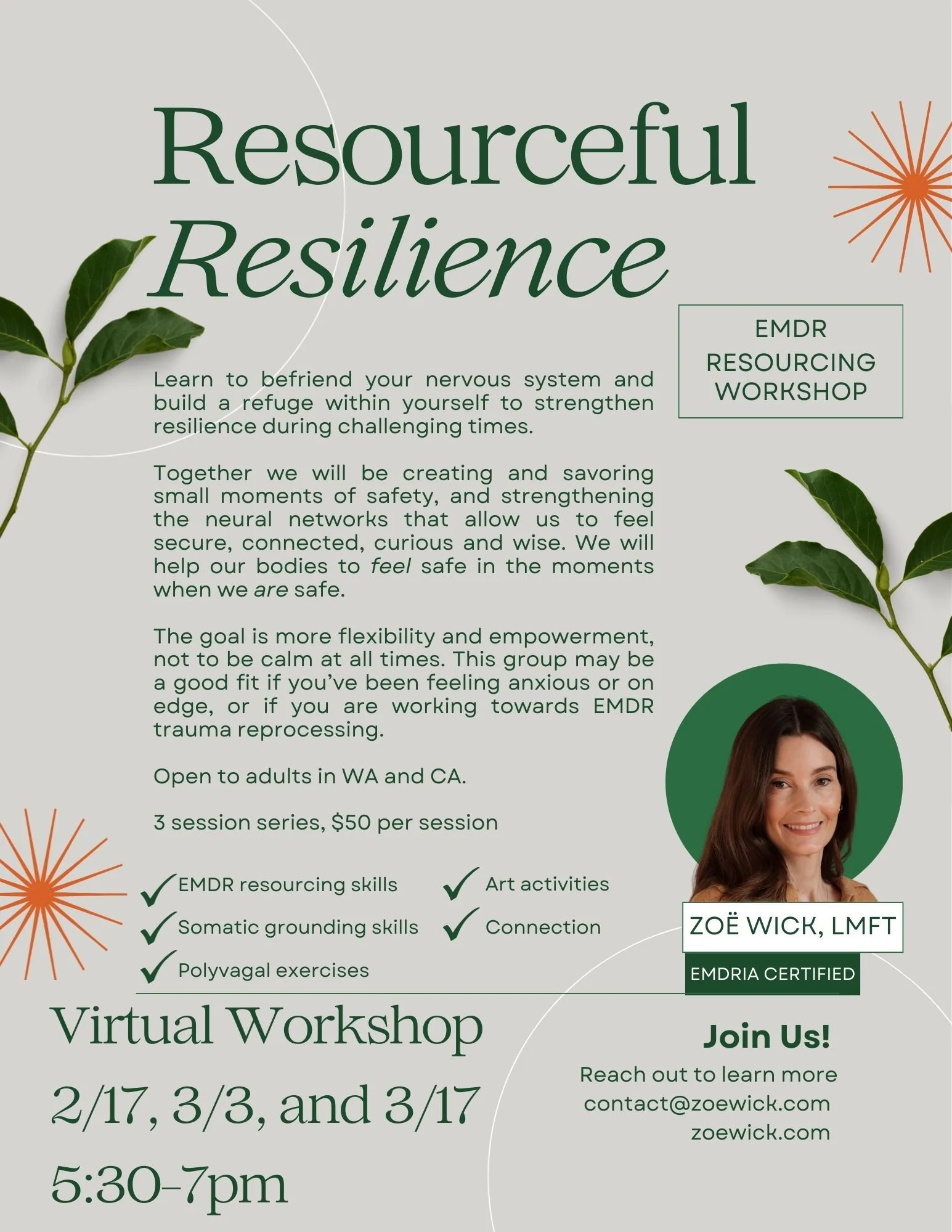 These online workshops will include calming EMDR resourcing skills, nervous system education and exercises (polyvagal exercises), and art activities. Art experience is not necessary and sharing with the group is optional.